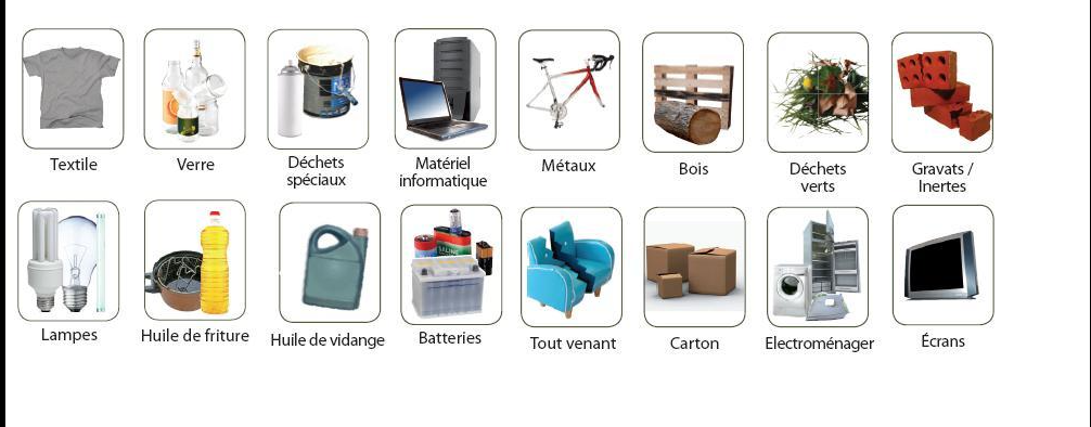 Pour faciliter le tri par les utilisateurs de la déchèterie, les déchets acceptés sont symbolisés par des pictogrammes à proximité des bennes ou conteneurs :